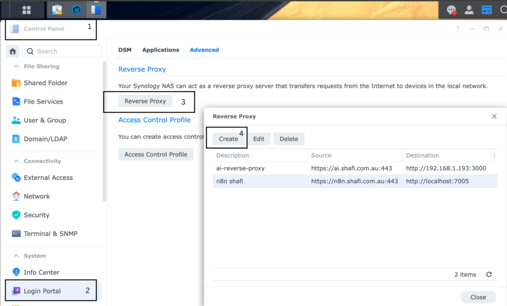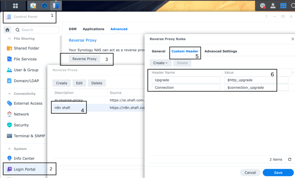To access n8n securely from outside my home network, I configured Synology’s built-in reverse proxy.